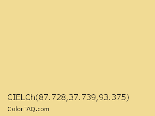 CIELCh 87.728,37.739,93.375 Color is a light yellow color and the nearest color is Chalky #eed794. Hex code #f1db94 and RGB value is rgb(241,219,148). In RGB color space, this color is composed of 95% red, 86% green, 58% blue, In CMYK color space, this color is composed of 0% cyan, 9% magenta, 39% yellow , 5% black , In HSL color space, this color has a hue angle of 46° , 77% saturation and 76% lightness.