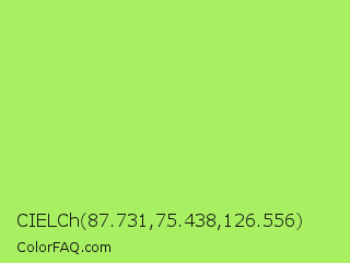 CIELCh 87.731,75.438,126.556 Color is a light green color and the nearest color is Inchworm #b2ec5d. Hex code #a8f061 and RGB value is rgb(168,240,97). In RGB color space, this color is composed of 66% red, 94% green, 38% blue, In CMYK color space, this color is composed of 30% cyan, 0% magenta, 60% yellow , 6% black , In HSL color space, this color has a hue angle of 90° , 83% saturation and 66% lightness.