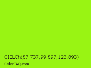 CIELCh 87.737,99.897,123.893 Color is a normal green color and the nearest color is Spring Bud #a7fc00. Hex code #99f413 and RGB value is rgb(153,244,19). In RGB color space, this color is composed of 60% red, 96% green, 7% blue, In CMYK color space, this color is composed of 37% cyan, 0% magenta, 92% yellow , 4% black , In HSL color space, this color has a hue angle of 84° , 91% saturation and 52% lightness.
