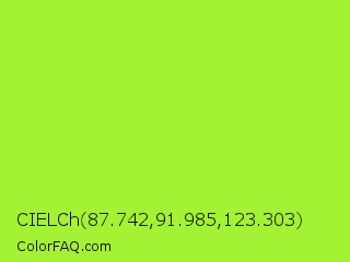CIELCh 87.742,91.985,123.303 Color is a normal green color and the nearest color is Green Lizard #a7f432. Hex code #a3f233 and RGB value is rgb(163,242,51). In RGB color space, this color is composed of 64% red, 95% green, 20% blue, In CMYK color space, this color is composed of 33% cyan, 0% magenta, 79% yellow , 5% black , In HSL color space, this color has a hue angle of 85° , 88% saturation and 57% lightness.