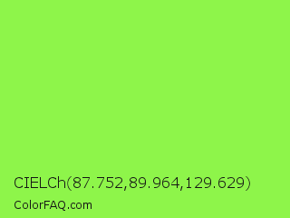 CIELCh 87.752,89.964,129.629 Color is a light green color and the nearest color is Kiwi #8ee53f. Hex code #8ef54a and RGB value is rgb(142,245,74). In RGB color space, this color is composed of 56% red, 96% green, 29% blue, In CMYK color space, this color is composed of 42% cyan, 0% magenta, 70% yellow , 4% black , In HSL color space, this color has a hue angle of 96° , 90% saturation and 63% lightness.