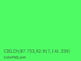 CIELCh 87.753,92.917,141.339 Color is a light green color and the nearest color is Screamin Green #66ff66. Hex code #4efb65 and RGB value is rgb(78,251,101). In RGB color space, this color is composed of 31% red, 98% green, 40% blue, In CMYK color space, this color is composed of 69% cyan, 0% magenta, 60% yellow , 2% black , In HSL color space, this color has a hue angle of 128° , 96% saturation and 65% lightness.