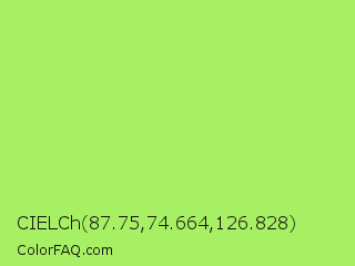 CIELCh 87.75,74.664,126.828 Color is a light green color and the nearest color is Inchworm #b2ec5d. Hex code #a8f063 and RGB value is rgb(168,240,99). In RGB color space, this color is composed of 66% red, 94% green, 39% blue, In CMYK color space, this color is composed of 30% cyan, 0% magenta, 59% yellow , 6% black , In HSL color space, this color has a hue angle of 91° , 82% saturation and 66% lightness.