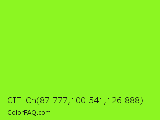 CIELCh 87.777,100.541,126.888 Color is a normal green color and the nearest color is Spring Frost #87ff2a. Hex code #8cf622 and RGB value is rgb(140,246,34). In RGB color space, this color is composed of 55% red, 96% green, 13% blue, In CMYK color space, this color is composed of 43% cyan, 0% magenta, 86% yellow , 4% black , In HSL color space, this color has a hue angle of 90° , 92% saturation and 55% lightness.