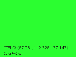 CIELCh 87.781,112.328,137.143 Color is a normal green color and the nearest color is Neon Green #39ff14. Hex code #2bfe30 and RGB value is rgb(43,254,48). In RGB color space, this color is composed of 17% red, 100% green, 19% blue, In CMYK color space, this color is composed of 83% cyan, 0% magenta, 81% yellow , 0% black , In HSL color space, this color has a hue angle of 121° , 99% saturation and 58% lightness.