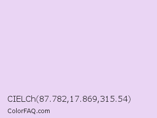 CIELCh 87.782,17.869,315.54 Color is a very light purple color and the nearest color is Snuff #e2d8ed. Hex code #ead5f4 and RGB value is rgb(234,213,244). In RGB color space, this color is composed of 92% red, 84% green, 96% blue, In CMYK color space, this color is composed of 4% cyan, 13% magenta, 0% yellow , 4% black , In HSL color space, this color has a hue angle of 281° , 58% saturation and 90% lightness.