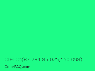 CIELCh 87.784,85.025,150.098 Color is a normal green color and the nearest color is Spring Green #00ff7f. Hex code #1cfc87 and RGB value is rgb(28,252,135). In RGB color space, this color is composed of 11% red, 99% green, 53% blue, In CMYK color space, this color is composed of 89% cyan, 0% magenta, 46% yellow , 1% black , In HSL color space, this color has a hue angle of 149° , 97% saturation and 55% lightness.