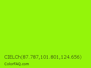 CIELCh 87.787,101.801,124.656 Color is a normal green color and the nearest color is Spring Bud #a7fc00. Hex code #94f50a and RGB value is rgb(148,245,10). In RGB color space, this color is composed of 58% red, 96% green, 4% blue, In CMYK color space, this color is composed of 40% cyan, 0% magenta, 96% yellow , 4% black , In HSL color space, this color has a hue angle of 85° , 92% saturation and 50% lightness.