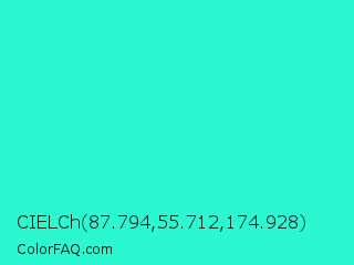 CIELCh 87.794,55.712,174.928 Color is a normal cyan color and the nearest color is Turquoise #40e0d0. Hex code #2bf7d1 and RGB value is rgb(43,247,209). In RGB color space, this color is composed of 17% red, 97% green, 82% blue, In CMYK color space, this color is composed of 83% cyan, 0% magenta, 15% yellow , 3% black , In HSL color space, this color has a hue angle of 169° , 93% saturation and 57% lightness.