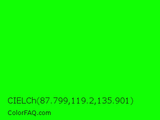 CIELCh 87.799,119.2,135.901 Color is a normal green color and the nearest color is Green #00ff00. Hex code #11ff04 and RGB value is rgb(17,255,4). In RGB color space, this color is composed of 7% red, 100% green, 2% blue, In CMYK color space, this color is composed of 93% cyan, 0% magenta, 98% yellow , 0% black , In HSL color space, this color has a hue angle of 117° , 100% saturation and 51% lightness.