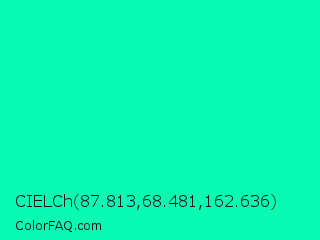 CIELCh 87.813,68.481,162.636 Color is a normal green color and the nearest color is Medium Spring Green #00fa9a. Hex code #08fab3 and RGB value is rgb(8,250,179). In RGB color space, this color is composed of 3% red, 98% green, 70% blue, In CMYK color space, this color is composed of 97% cyan, 0% magenta, 28% yellow , 2% black , In HSL color space, this color has a hue angle of 162° , 96% saturation and 51% lightness.