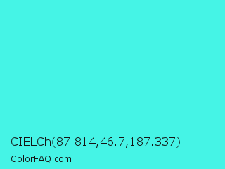CIELCh 87.814,46.7,187.337 Color is a light cyan color and the nearest color is Turquoise #40e0d0. Hex code #45f4e6 and RGB value is rgb(69,244,230). In RGB color space, this color is composed of 27% red, 96% green, 90% blue, In CMYK color space, this color is composed of 72% cyan, 0% magenta, 6% yellow , 4% black , In HSL color space, this color has a hue angle of 175° , 89% saturation and 61% lightness.
