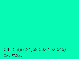 CIELCh 87.81,68.502,162.646 Color is a normal green color and the nearest color is Medium Spring Green #00fa9a. Hex code #07fab3 and RGB value is rgb(7,250,179). In RGB color space, this color is composed of 3% red, 98% green, 70% blue, In CMYK color space, this color is composed of 97% cyan, 0% magenta, 28% yellow , 2% black , In HSL color space, this color has a hue angle of 162° , 96% saturation and 50% lightness.