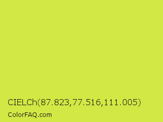 CIELCh 87.823,77.516,111.005 Color is a normal yellow color and the nearest color is Maximum Green Yellow #d9e650. Hex code #d1e845 and RGB value is rgb(209,232,69). In RGB color space, this color is composed of 82% red, 91% green, 27% blue, In CMYK color space, this color is composed of 10% cyan, 0% magenta, 70% yellow , 9% black , In HSL color space, this color has a hue angle of 68° , 78% saturation and 59% lightness.