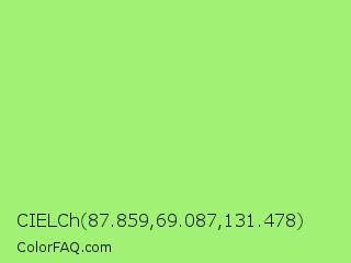 CIELCh 87.859,69.087,131.478 Color is a light green color and the nearest color is Inchworm #b2ec5d. Hex code #a1f175 and RGB value is rgb(161,241,117). In RGB color space, this color is composed of 63% red, 95% green, 46% blue, In CMYK color space, this color is composed of 33% cyan, 0% magenta, 51% yellow , 5% black , In HSL color space, this color has a hue angle of 99° , 82% saturation and 70% lightness.