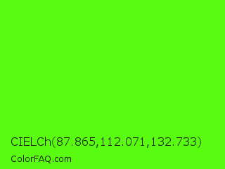 CIELCh 87.865,112.071,132.733 Color is a normal green color and the nearest color is Bright Green #66ff00. Hex code #59fc11 and RGB value is rgb(89,252,17). In RGB color space, this color is composed of 35% red, 99% green, 7% blue, In CMYK color space, this color is composed of 65% cyan, 0% magenta, 93% yellow , 1% black , In HSL color space, this color has a hue angle of 102° , 98% saturation and 53% lightness.