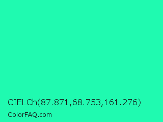 CIELCh 87.871,68.753,161.276 Color is a normal green color and the nearest color is Medium Spring Green #00fa9a. Hex code #1ffab0 and RGB value is rgb(31,250,176). In RGB color space, this color is composed of 12% red, 98% green, 69% blue, In CMYK color space, this color is composed of 88% cyan, 0% magenta, 30% yellow , 2% black , In HSL color space, this color has a hue angle of 160° , 96% saturation and 55% lightness.