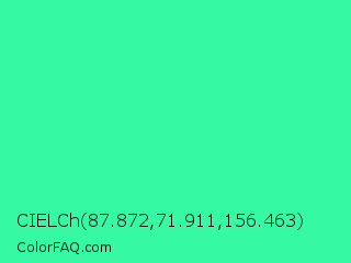 CIELCh 87.872,71.911,156.463 Color is a normal green color and the nearest color is Eucalyptus #44d7a8. Hex code #36faa3 and RGB value is rgb(54,250,163). In RGB color space, this color is composed of 21% red, 98% green, 64% blue, In CMYK color space, this color is composed of 78% cyan, 0% magenta, 35% yellow , 2% black , In HSL color space, this color has a hue angle of 153° , 95% saturation and 60% lightness.
