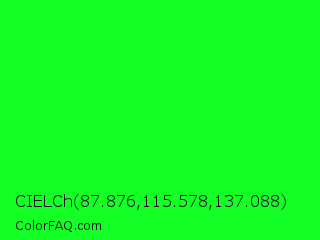 CIELCh 87.876,115.578,137.088 Color is a normal green color and the nearest color is Neon Green #39ff14. Hex code #14ff26 and RGB value is rgb(20,255,38). In RGB color space, this color is composed of 8% red, 100% green, 15% blue, In CMYK color space, this color is composed of 92% cyan, 0% magenta, 85% yellow , 0% black , In HSL color space, this color has a hue angle of 125° , 100% saturation and 54% lightness.