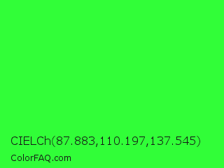 CIELCh 87.883,110.197,137.545 Color is a normal green color and the nearest color is Neon Green #39ff14. Hex code #31fe38 and RGB value is rgb(49,254,56). In RGB color space, this color is composed of 19% red, 100% green, 22% blue, In CMYK color space, this color is composed of 81% cyan, 0% magenta, 78% yellow , 0% black , In HSL color space, this color has a hue angle of 122° , 99% saturation and 59% lightness.
