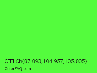 CIELCh 87.893,104.957,135.835 Color is a light green color and the nearest color is Screamin Green #66ff66. Hex code #54fc3d and RGB value is rgb(84,252,61). In RGB color space, this color is composed of 33% red, 99% green, 24% blue, In CMYK color space, this color is composed of 67% cyan, 0% magenta, 76% yellow , 1% black , In HSL color space, this color has a hue angle of 113° , 97% saturation and 61% lightness.