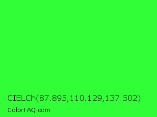 CIELCh 87.895,110.129,137.502 Color is a normal green color and the nearest color is Neon Green #39ff14. Hex code #32fe38 and RGB value is rgb(50,254,56). In RGB color space, this color is composed of 20% red, 100% green, 22% blue, In CMYK color space, this color is composed of 80% cyan, 0% magenta, 78% yellow , 0% black , In HSL color space, this color has a hue angle of 122° , 99% saturation and 60% lightness.
