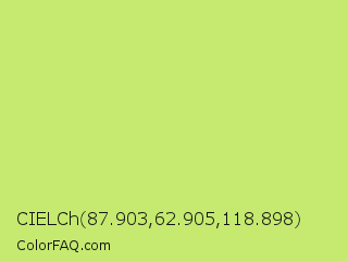 CIELCh 87.903,62.905,118.898 Color is a light lime color and the nearest color is Yellow Green #c5e17a. Hex code #c5ea6f and RGB value is rgb(197,234,111). In RGB color space, this color is composed of 77% red, 92% green, 44% blue, In CMYK color space, this color is composed of 16% cyan, 0% magenta, 53% yellow , 8% black , In HSL color space, this color has a hue angle of 78° , 75% saturation and 68% lightness.