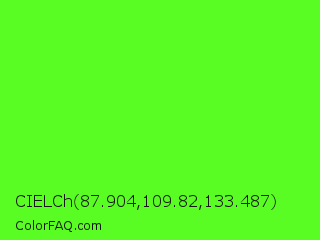 CIELCh 87.904,109.82,133.487 Color is a normal green color and the nearest color is Neon Green #39ff14. Hex code #59fc23 and RGB value is rgb(89,252,35). In RGB color space, this color is composed of 35% red, 99% green, 14% blue, In CMYK color space, this color is composed of 65% cyan, 0% magenta, 86% yellow , 1% black , In HSL color space, this color has a hue angle of 105° , 97% saturation and 56% lightness.