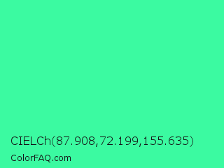 CIELCh 87.908,72.199,155.635 Color is a light green color and the nearest color is Eucalyptus #44d7a8. Hex code #3bfaa1 and RGB value is rgb(59,250,161). In RGB color space, this color is composed of 23% red, 98% green, 63% blue, In CMYK color space, this color is composed of 76% cyan, 0% magenta, 36% yellow , 2% black , In HSL color space, this color has a hue angle of 152° , 95% saturation and 61% lightness.