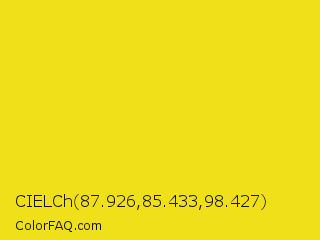 CIELCh 87.926,85.433,98.427 Color is a normal yellow color and the nearest color is Ripe Lemon #f4d81c. Hex code #f0e01a and RGB value is rgb(240,224,26). In RGB color space, this color is composed of 94% red, 88% green, 10% blue, In CMYK color space, this color is composed of 0% cyan, 7% magenta, 89% yellow , 6% black , In HSL color space, this color has a hue angle of 56° , 88% saturation and 52% lightness.