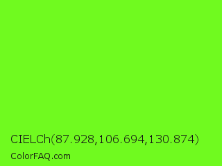CIELCh 87.928,106.694,130.874 Color is a normal green color and the nearest color is Spring Frost #87ff2a. Hex code #70fa1f and RGB value is rgb(112,250,31). In RGB color space, this color is composed of 44% red, 98% green, 12% blue, In CMYK color space, this color is composed of 55% cyan, 0% magenta, 88% yellow , 2% black , In HSL color space, this color has a hue angle of 98° , 96% saturation and 55% lightness.