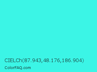CIELCh 87.943,48.176,186.904 Color is a normal cyan color and the nearest color is Turquoise #40e0d0. Hex code #3bf5e6 and RGB value is rgb(59,245,230). In RGB color space, this color is composed of 23% red, 96% green, 90% blue, In CMYK color space, this color is composed of 76% cyan, 0% magenta, 6% yellow , 4% black , In HSL color space, this color has a hue angle of 175° , 90% saturation and 60% lightness.