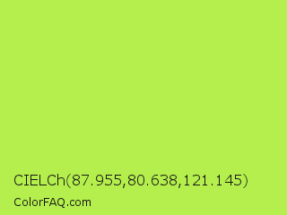 CIELCh 87.955,80.638,121.145 Color is a light green color and the nearest color is Inchworm #b2ec5d. Hex code #b4ef4d and RGB value is rgb(180,239,77). In RGB color space, this color is composed of 71% red, 94% green, 30% blue, In CMYK color space, this color is composed of 25% cyan, 0% magenta, 68% yellow , 6% black , In HSL color space, this color has a hue angle of 82° , 84% saturation and 62% lightness.