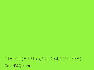CIELCh 87.955,92.054,127.558 Color is a light green color and the nearest color is French Lime #9efd38. Hex code #94f540 and RGB value is rgb(148,245,64). In RGB color space, this color is composed of 58% red, 96% green, 25% blue, In CMYK color space, this color is composed of 40% cyan, 0% magenta, 74% yellow , 4% black , In HSL color space, this color has a hue angle of 92° , 90% saturation and 61% lightness.