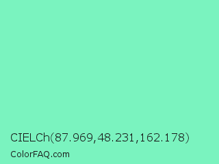 CIELCh 87.969,48.231,162.178 Color is a light green color and the nearest color is Aquamarine #7fffd4. Hex code #7af3bf and RGB value is rgb(122,243,191). In RGB color space, this color is composed of 48% red, 95% green, 75% blue, In CMYK color space, this color is composed of 50% cyan, 0% magenta, 21% yellow , 5% black , In HSL color space, this color has a hue angle of 154° , 83% saturation and 72% lightness.