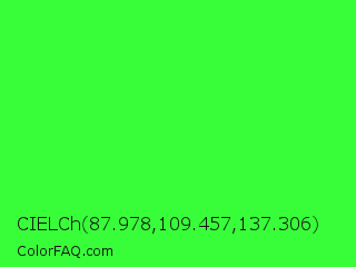 CIELCh 87.978,109.457,137.306 Color is a light green color and the nearest color is Neon Green #39ff14. Hex code #38fe39 and RGB value is rgb(56,254,57). In RGB color space, this color is composed of 22% red, 100% green, 22% blue, In CMYK color space, this color is composed of 78% cyan, 0% magenta, 78% yellow , 0% black , In HSL color space, this color has a hue angle of 120° , 99% saturation and 61% lightness.