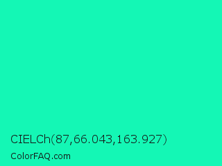 CIELCh 87,66.043,163.927 Color is a normal green color and the nearest color is Medium Spring Green #00fa9a. Hex code #14f7b5 and RGB value is rgb(20,247,181). In RGB color space, this color is composed of 8% red, 97% green, 71% blue, In CMYK color space, this color is composed of 92% cyan, 0% magenta, 27% yellow , 3% black , In HSL color space, this color has a hue angle of 163° , 93% saturation and 52% lightness.