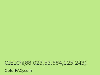 CIELCh 88.023,53.584,125.243 Color is a light green color and the nearest color is Sulu #c1f07c. Hex code #beeb87 and RGB value is rgb(190,235,135). In RGB color space, this color is composed of 75% red, 92% green, 53% blue, In CMYK color space, this color is composed of 19% cyan, 0% magenta, 43% yellow , 8% black , In HSL color space, this color has a hue angle of 87° , 71% saturation and 73% lightness.