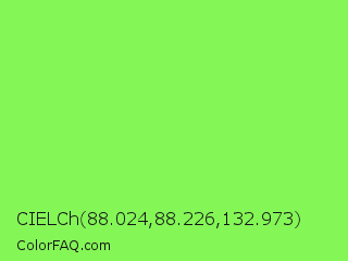 CIELCh 88.024,88.226,132.973 Color is a light green color and the nearest color is Kiwi #8ee53f. Hex code #84f757 and RGB value is rgb(132,247,87). In RGB color space, this color is composed of 52% red, 97% green, 34% blue, In CMYK color space, this color is composed of 47% cyan, 0% magenta, 65% yellow , 3% black , In HSL color space, this color has a hue angle of 103° , 91% saturation and 65% lightness.
