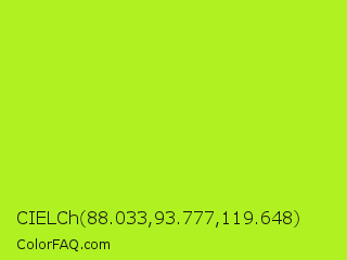 CIELCh 88.033,93.777,119.648 Color is a normal lime color and the nearest color is Green Lizard #a7f432. Hex code #aff121 and RGB value is rgb(175,241,33). In RGB color space, this color is composed of 69% red, 95% green, 13% blue, In CMYK color space, this color is composed of 27% cyan, 0% magenta, 86% yellow , 5% black , In HSL color space, this color has a hue angle of 79° , 88% saturation and 54% lightness.
