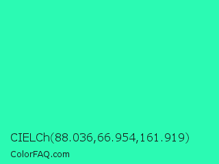 CIELCh 88.036,66.954,161.919 Color is a normal green color and the nearest color is Turquoise PWG #30d5c8. Hex code #2bfab3 and RGB value is rgb(43,250,179). In RGB color space, this color is composed of 17% red, 98% green, 70% blue, In CMYK color space, this color is composed of 83% cyan, 0% magenta, 28% yellow , 2% black , In HSL color space, this color has a hue angle of 159° , 95% saturation and 57% lightness.