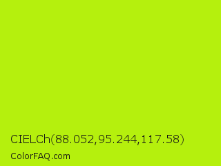 CIELCh 88.052,95.244,117.58 Color is a normal lime color and the nearest color is Inch Worm #b0e313. Hex code #b5f00d and RGB value is rgb(181,240,13). In RGB color space, this color is composed of 71% red, 94% green, 5% blue, In CMYK color space, this color is composed of 25% cyan, 0% magenta, 95% yellow , 6% black , In HSL color space, this color has a hue angle of 76° , 90% saturation and 50% lightness.