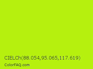 CIELCh 88.054,95.065,117.619 Color is a normal lime color and the nearest color is Inch Worm #b0e313. Hex code #b5f00f and RGB value is rgb(181,240,15). In RGB color space, this color is composed of 71% red, 94% green, 6% blue, In CMYK color space, this color is composed of 25% cyan, 0% magenta, 94% yellow , 6% black , In HSL color space, this color has a hue angle of 76° , 88% saturation and 50% lightness.