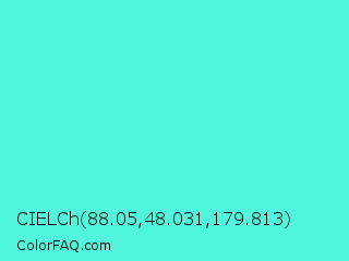 CIELCh 88.05,48.031,179.813 Color is a light cyan color and the nearest color is Turquoise #40e0d0. Hex code #51f5db and RGB value is rgb(81,245,219). In RGB color space, this color is composed of 32% red, 96% green, 86% blue, In CMYK color space, this color is composed of 67% cyan, 0% magenta, 11% yellow , 4% black , In HSL color space, this color has a hue angle of 170° , 89% saturation and 64% lightness.