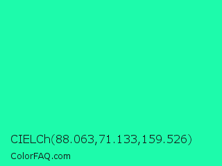CIELCh 88.063,71.133,159.526 Color is a normal green color and the nearest color is Medium Spring Green #00fa9a. Hex code #1dfbab and RGB value is rgb(29,251,171). In RGB color space, this color is composed of 11% red, 98% green, 67% blue, In CMYK color space, this color is composed of 88% cyan, 0% magenta, 32% yellow , 2% black , In HSL color space, this color has a hue angle of 158° , 97% saturation and 55% lightness.