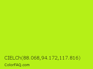 CIELCh 88.068,94.172,117.816 Color is a normal lime color and the nearest color is Inch Worm #b0e313. Hex code #b5f017 and RGB value is rgb(181,240,23). In RGB color space, this color is composed of 71% red, 94% green, 9% blue, In CMYK color space, this color is composed of 25% cyan, 0% magenta, 90% yellow , 6% black , In HSL color space, this color has a hue angle of 76° , 88% saturation and 52% lightness.