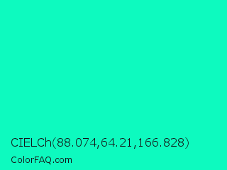 CIELCh 88.074,64.21,166.828 Color is a normal cyan color and the nearest color is Bright Turquoise #08e8de. Hex code #0dfabf and RGB value is rgb(13,250,191). In RGB color space, this color is composed of 5% red, 98% green, 75% blue, In CMYK color space, this color is composed of 95% cyan, 0% magenta, 24% yellow , 2% black , In HSL color space, this color has a hue angle of 165° , 96% saturation and 52% lightness.