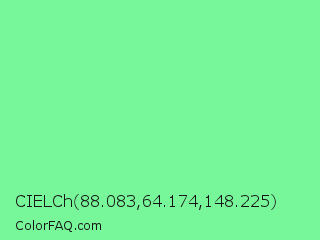 CIELCh 88.083,64.174,148.225 Color is a light green color and the nearest color is Light Green #90ee90. Hex code #78f69a and RGB value is rgb(120,246,154). In RGB color space, this color is composed of 47% red, 96% green, 60% blue, In CMYK color space, this color is composed of 51% cyan, 0% magenta, 37% yellow , 4% black , In HSL color space, this color has a hue angle of 136° , 88% saturation and 72% lightness.