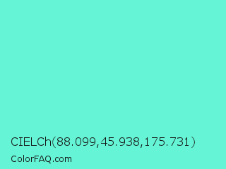 CIELCh 88.099,45.938,175.731 Color is a light cyan color and the nearest color is Aquamarine #7fffd4. Hex code #65f4d5 and RGB value is rgb(101,244,213). In RGB color space, this color is composed of 40% red, 96% green, 84% blue, In CMYK color space, this color is composed of 59% cyan, 0% magenta, 13% yellow , 4% black , In HSL color space, this color has a hue angle of 167° , 87% saturation and 68% lightness.