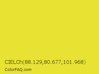 CIELCh 88.129,80.677,101.968 Color is a normal yellow color and the nearest color is Dandelion #f0e130. Hex code #e8e333 and RGB value is rgb(232,227,51). In RGB color space, this color is composed of 91% red, 89% green, 20% blue, In CMYK color space, this color is composed of 0% cyan, 2% magenta, 78% yellow , 9% black , In HSL color space, this color has a hue angle of 58° , 80% saturation and 55% lightness.